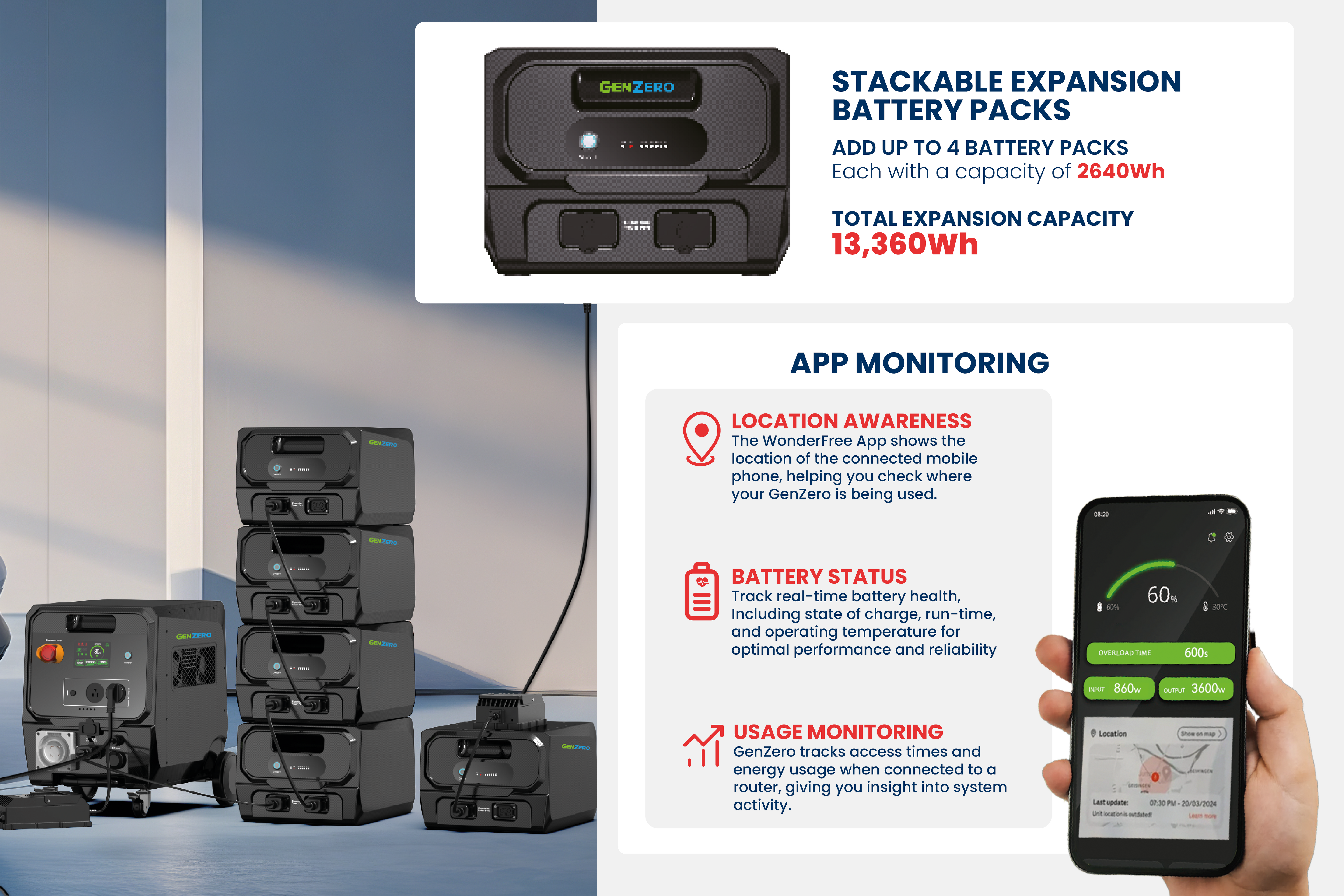 Expandable battery architecture supports stackable battery modules to scale capacity up to 13,200Wh.