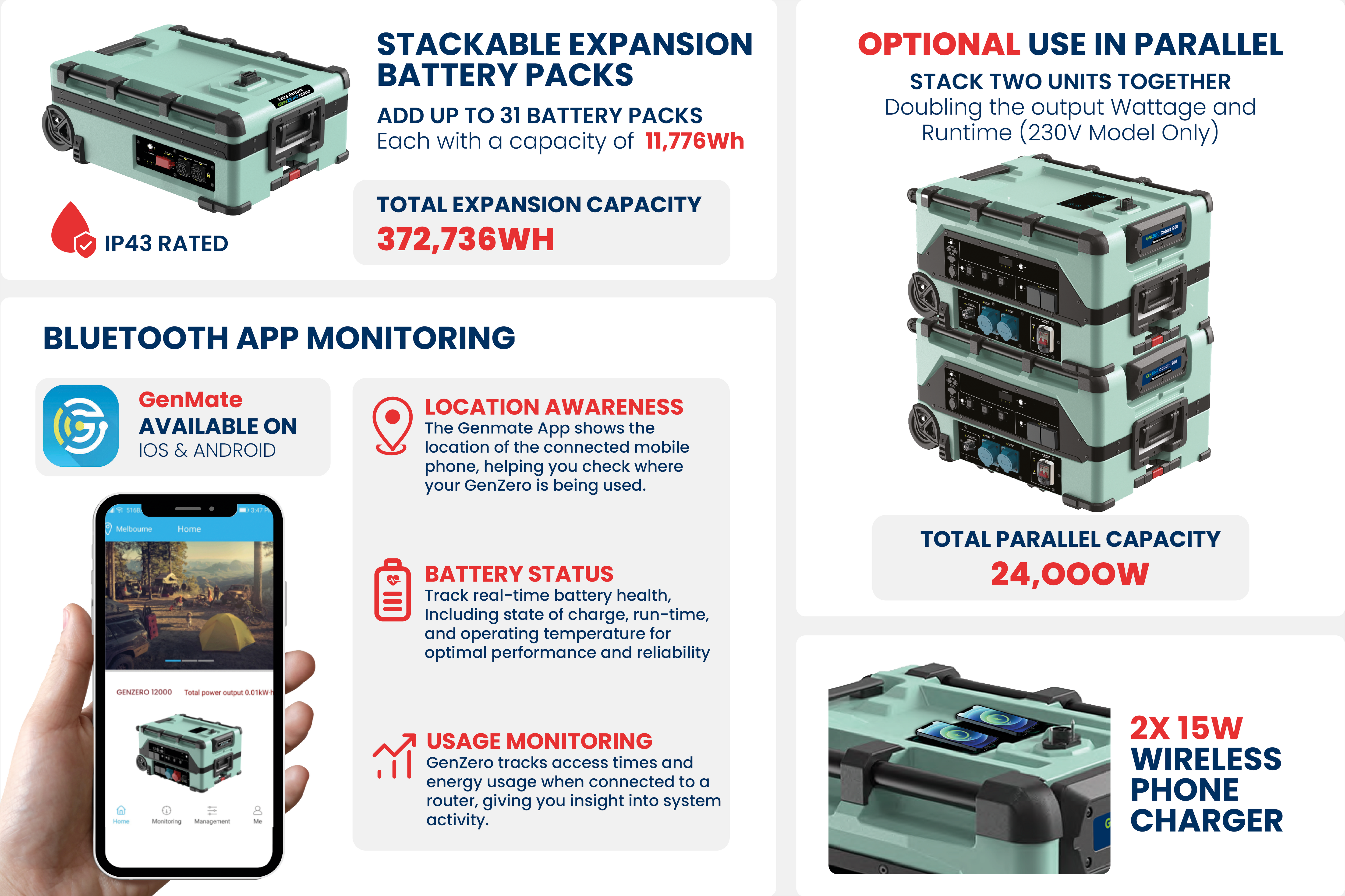 The GenZero Cobalt 12000 delivers industrial-grade portable power. Its LFP battery technology provides 3000+ cycles and 10 years of reliable performance with enhanced safety. Recharge to 80% in just one hour or reach full capacity in 90 minutes, minimising downtime on job sites.
