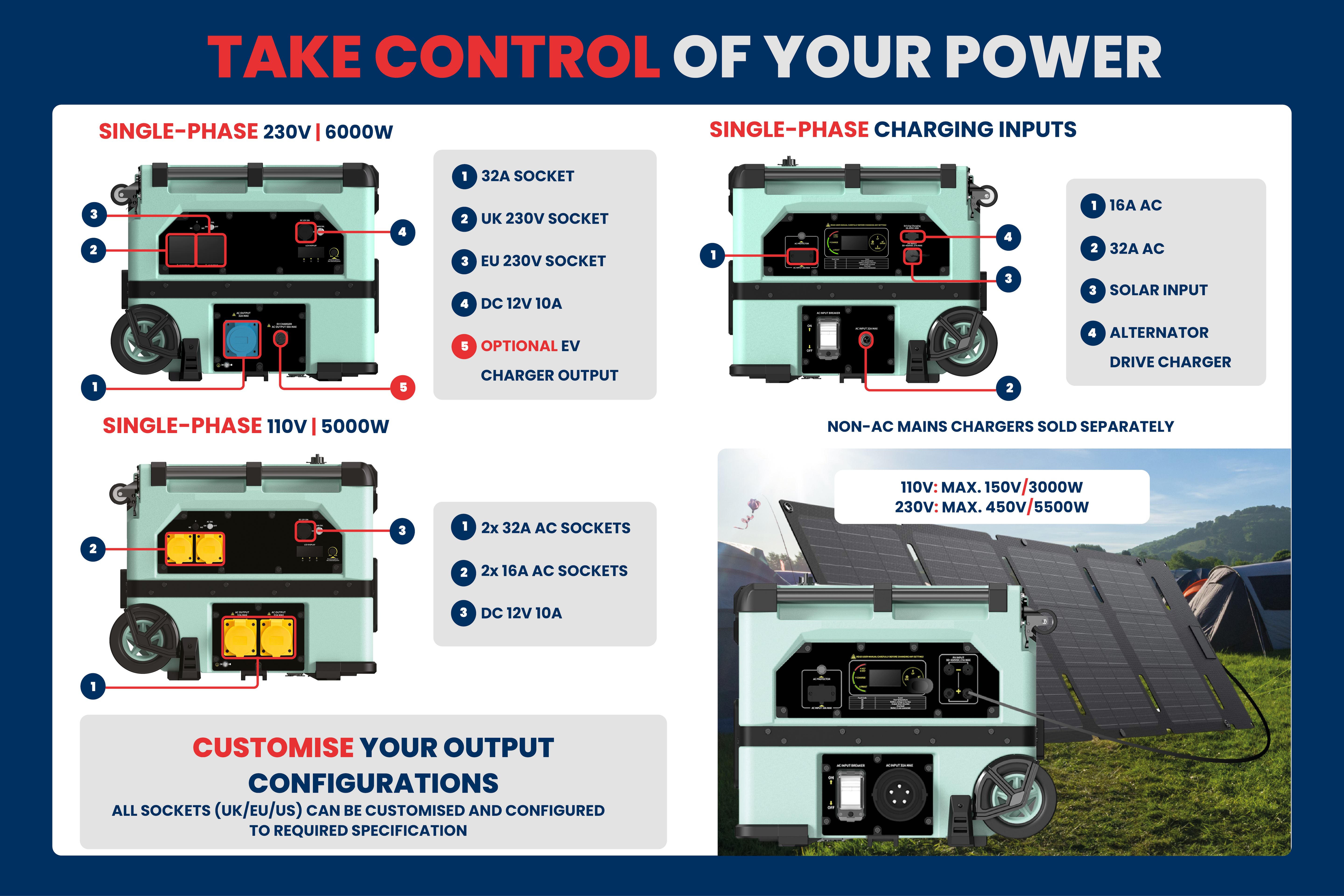 Comprehensive AC and DC output configuration supports UK, EU, 16A and 32A site equipment connections.